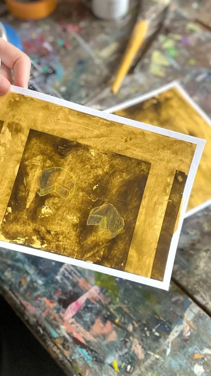 Mixed Media: Photographs of New Orleans, Louisiana on canvas with gold acrylic paint, matted, and framed in natural wood.